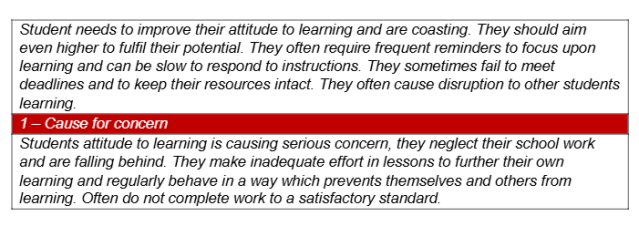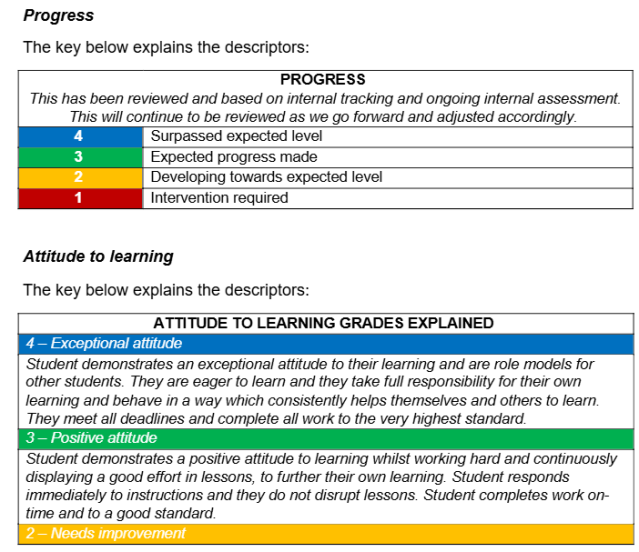 In each lesson, a 1-4 progress mark is given based on the lesson learning objective and is signified with 1- red, 2- amber, 3-green, 4- blue. For the end of term report an average of these scores is determined.