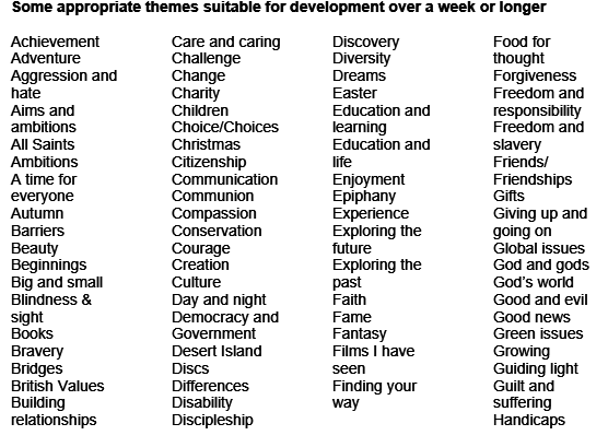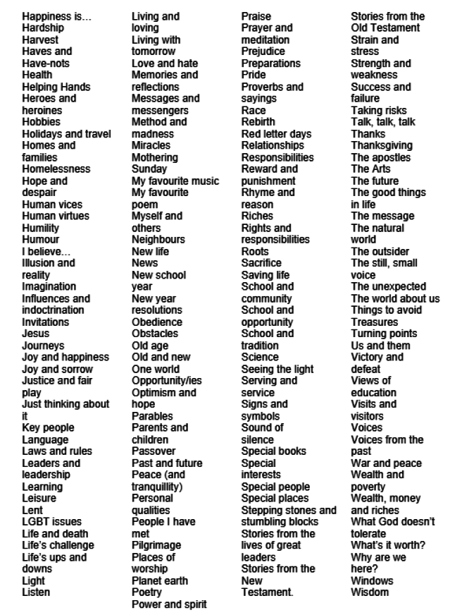 Some aspects on this list may not be considered appropriate but others may form the basis of a week’s collective worship. Future planning may therefore use the same theme again but explore a different aspect. Materials from religious and non-religious sources may be used to support the theme.